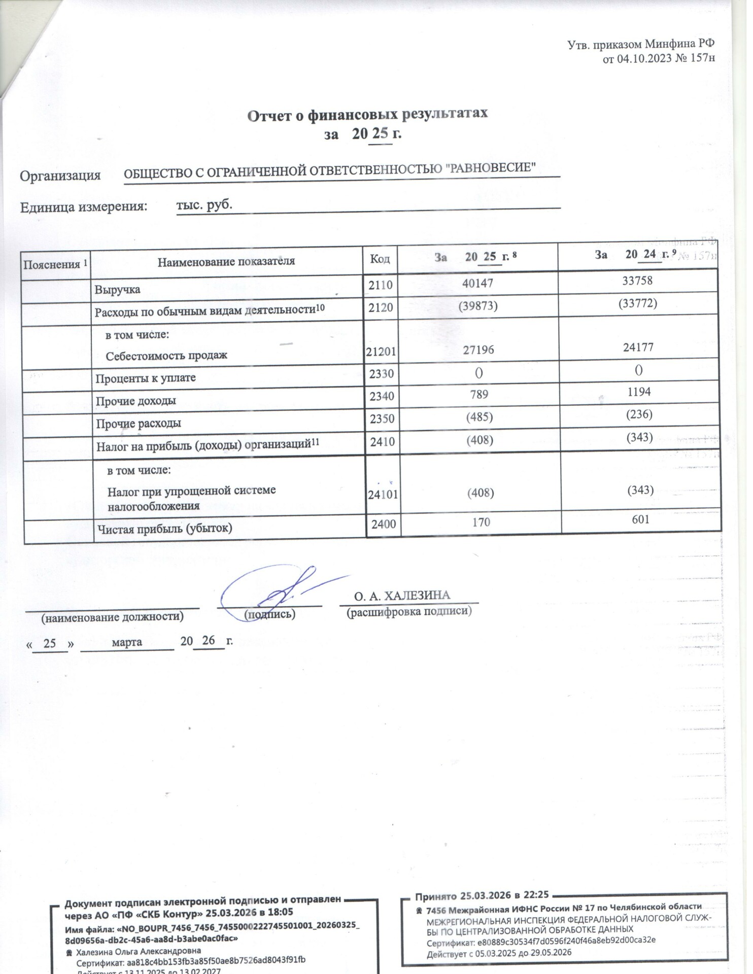 - Отчет о финансовых результатах по ООО "Равновесие" за 2023 год. 04.04.2024