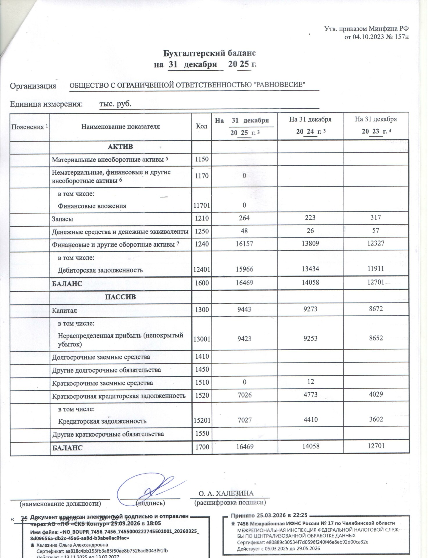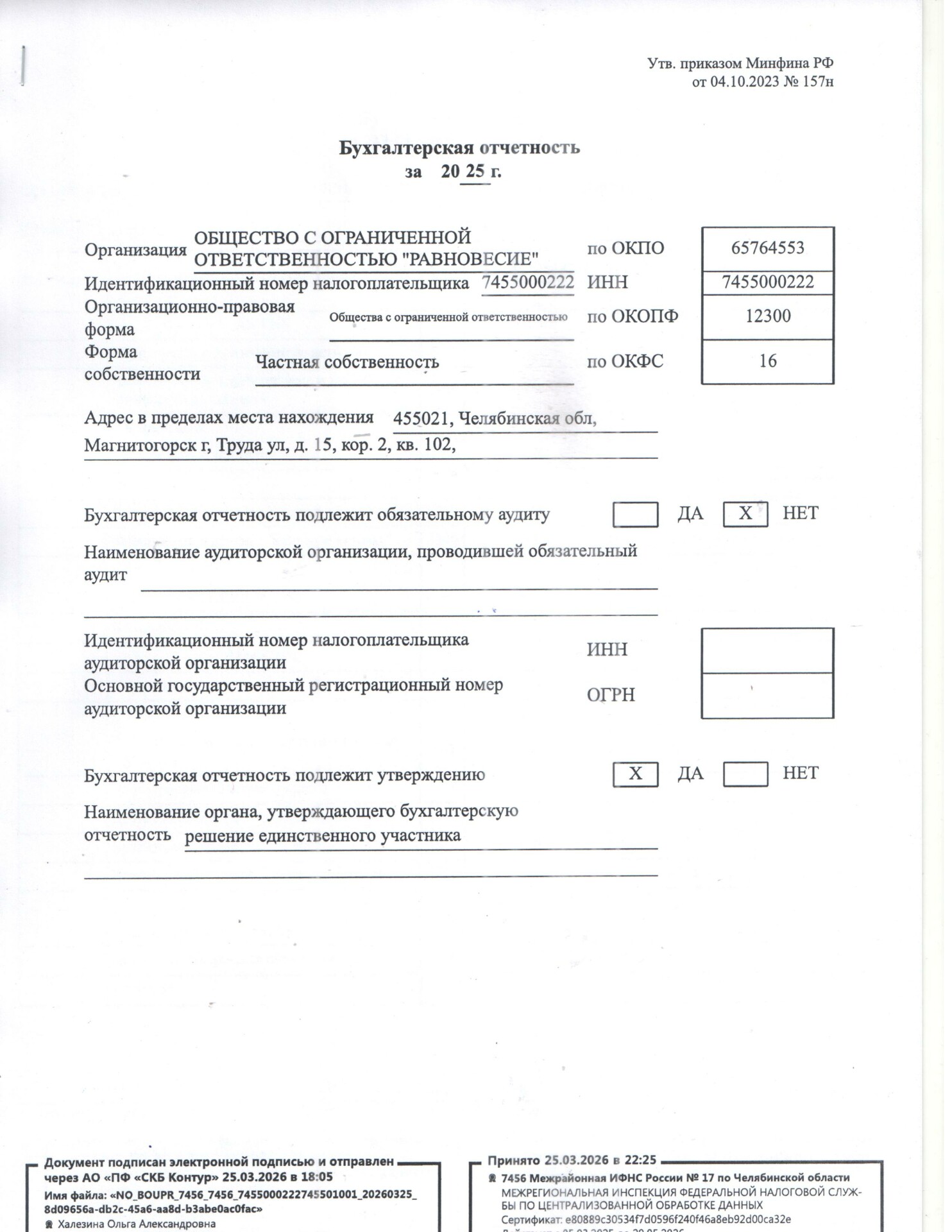 - Бухгалтерский баланс по ООО "Равновесие" за 2023 год. 04.04.2024